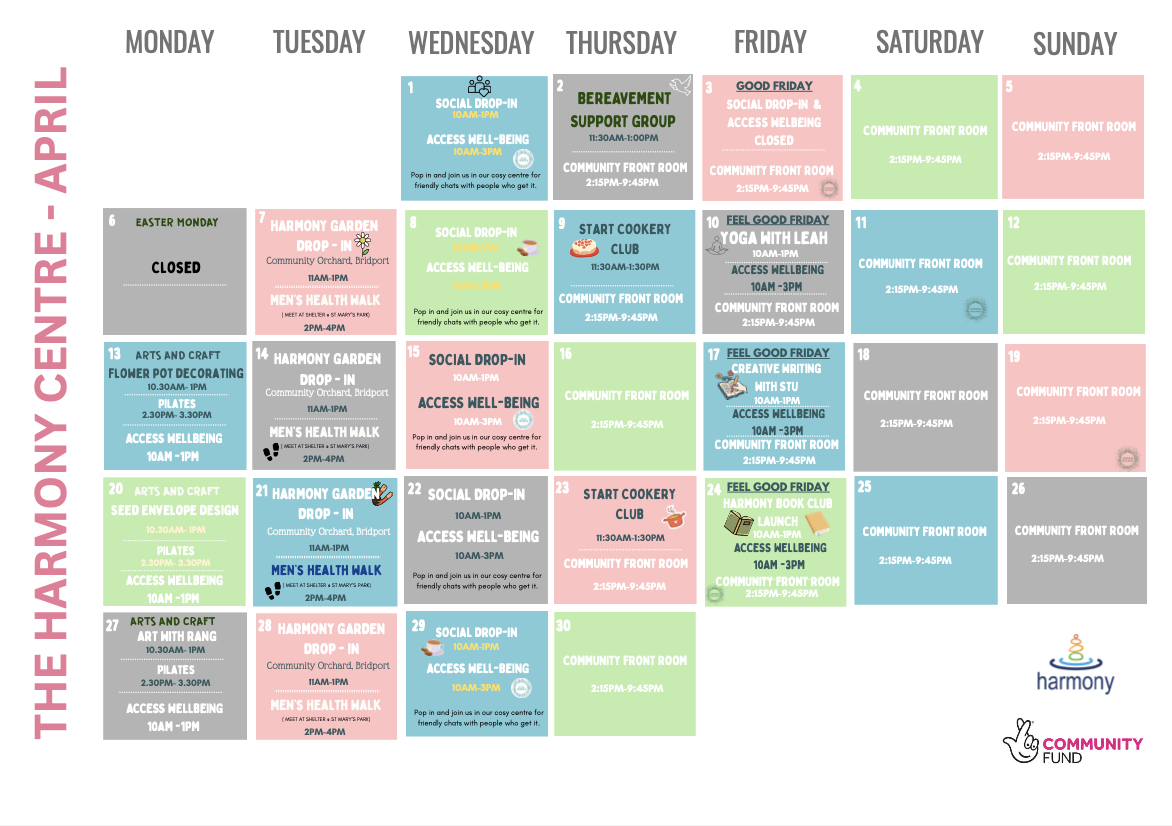 April calendar - Harmony Drop-In & all other sessions at The Harmony Centre